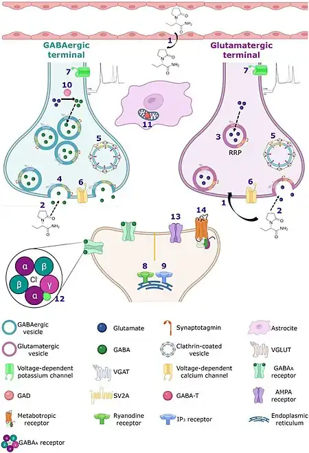 {{cite journal}}: CS1 maint: unflagged free DOI (link) - ↑ Lynch BA, Lambeng N, Nocka K, et al. (June 2004). "The synaptic vesicle protein SV2A is the binding site for the antiepileptic drug levetiracetam". Proc Natl Acad Sci USA. 101 (26): 9861–6. Bibcode:2004PNAS..101.9861L. doi:10.1073/pnas.0308208101. PMC 470764. PMID 15210974.