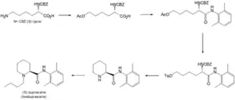 A 5-step process to synthesise levobupivacaine from Nα-CBZ (S)-lysine, published in 1996,[19] is depicted in Scheme 1. The key steps in this process include oxidative de-animation and stereospecific ring closure to form the pipecolamide core structure. This method is claimed to be efficient, but showed to be dangerous for mass production due to the high risk of explosion of the diazonium salt intermediates.