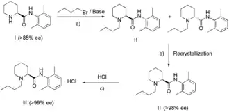 A more recent patent from 2008,[20] consists of a 3-step process (see Scheme 2) to synthesise levobupivacaine hydrochloride of an optical purity of at least 99%. (S)-2,6-pipecocholxylide (I) is reacted with 1-bromobutane and a base (a), such as potassium carbonate, to obtain a solution of (S)-bupivacaine (II) and its enantiomers. Recrystallisation of this solution with a solvent (b), preferably cyclohexane, can lead to an optical purity of at least 98% levobupivacaine. Lastly, the addition of hydrochloride (c) is possible.