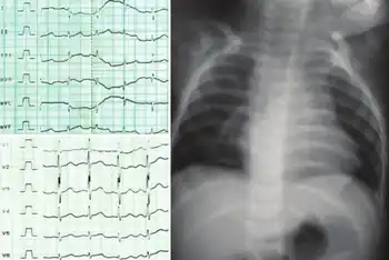 | Electrocardiogram left showed normal sinus rhythm with right ventricular hypertrophy with right axis deviation. Chest roentogram right showed levocardia, oligemia, cardiomegaly of right ventricle | |