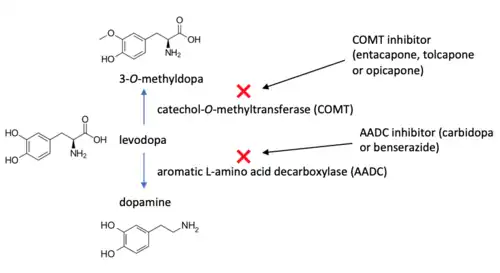 Levodopa is the immediate precursor to dopamine. Entacapone is a selective, reversible catechol-O-methyltransferase (COMT) inhibitor that prevents the degradation of levodopa. Entacapone does not cross the blood–brain barrier. Carbidopa is a peripheral aromatic L-amino acid decarboxylase (AADC) inhibitor. Carbidopa, which also does not cross the blood–brain barrier, is combined with levodopa to prevent its conversion to dopamine in the periphery.[11]