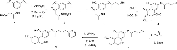 Dane salt formation between 3,5-dimethoxyaniline and ethyl acetoacetate followed by borohydrate reduction gives synthon 1. The amino group is protected by rxn with ethyl chloroformate, the ester group is saponified, and then cyclodehydration with polyphosphoric acid leads to the dihydroquinoline ring system (2). Deblocking with HBr is followed by etherification of the nonchelated phenolic hydroxyl gives 3. Treatment with NaH and ethyl formate results in both N-formylation and C-formylation of the active methylene to give 4. Michael addition of methyl vinyl ketone (MVP) followed by successive base treatments to remove the activating C-formyl group and then to complete the Robinson annulation to give 5. Lithium in liquid ammonia reduces the olefinic linkage and successive acetylation and sodium borohydrate reductions complete the synthesis of nantradol (6).