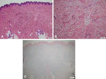 | Cutaneous mucinosis of infancy (Papular mucinosis of infancy)-a,b)Subtle thickening of the reticular dermis with widening of the interstitial space c)highlight the increased mucin. |