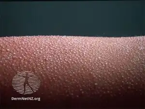 | Symptoms | Follicular keratotic small bumps that are grouped into large patches[2] |