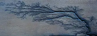 A Lichtenberg figure (German: Lichtenberg-Figur), or Lichtenberg dust figure, is a branching electric discharge that sometimes appears on the surface or in the interior of insulating materials. Lichtenberg figures are often associated with the progressive deterioration of high-voltage components and equipment. The study of planar Lichtenberg figures along insulating surfaces and 3D electrical trees within insulating materials often provides engineers with valuable insights for improving the long-term reliability of high-voltage equipment. Lichtenberg figures are now known to occur on or within solids, liquids, and gases during electrical breakdown.