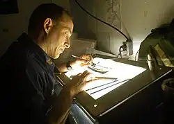 A light table[1] is a viewing device that is used to review photographic film or artwork placed on top of it. The horizontal form of a self-standing lightbox provides even illumination of the subject from below, or through a translucent cover placed in front of a fluorescent light, which emits a small amount of heat.