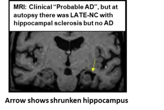 At present, LATE can only be diagnosed with certainty at autopsy. The terminology used to refer to the brain changes identified in autopsy-confirmed LATE is: LATE neuropathologic change (LATE-NC). The diagnosis of LATE-NC at autopsy requires detection of pathologic TDP-43 protein deposits in the brain. For reasons that are presently unknown, the disease process of LATE-NC preferentially affects medial temporal lobe structures of the brain, particularly the amygdala and hippocampus.[2] In a significant proportion of persons with LATE-NC, there is atrophy, cell loss and astrogliosis in the hippocampus, diagnosable at autopsy (and somewhat less specifically via MRI during life) as hippocampal sclerosis.[3] Brains with LATE-NC and hippocampal sclerosis are relatively more affected clinically than those with LATE-NC alone.[4]
