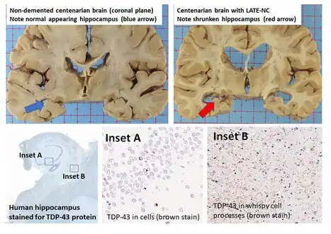 - ↑ Harrison WT, Lusk JB, Liu B, Ervin JF, Johnson KG, Green CL, et al. (November 2021). "Limbic-predominant age-related TDP-43 encephalopathy neuropathological change (LATE-NC) is independently associated with dementia and strongly associated with arteriolosclerosis in the oldest-old". Acta Neuropathologica. 142 (5): 917–919. doi:10.1007/s00401-021-02360-w. PMC 8816525. PMID 34415381.