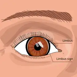 The limbus sign is a ring of dystrophic calcification evident as a "milky precipitate" (i.e. abnormal white color) at the corneal limbus. The corneal limbus is the part of the eye where the cornea (front/center) meets the sclera (white part of the eye). Thought to be caused by increased calcium concentration in the blood, this sign however persists after calcium phosphate concentration returns to normal.[1] Compare the limbus sign (calcification) with arcus senilis (lipid).[2]