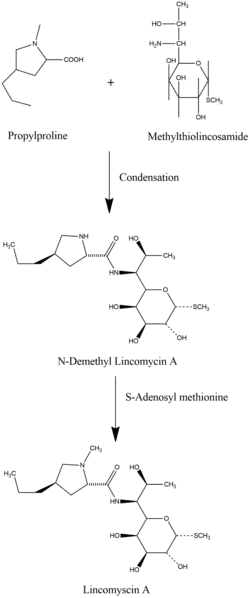 Chemical synthesis of lincomycin A. Propylproline and methylthio-lincosamide are joined via a condensation reaction. This reaction forms N-demethyllincomycin A, which is methylated via S-adenosylmethionine to form lincomycin A.