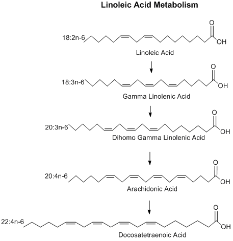 The metabolism of LA to AA begins with the conversion of LA into gamma-linolenic acid (GLA), effected by Δ6 desaturase.[18] GLA is converted to dihomo-γ-linolenic acid (DGLA), the immediate precursor to AA.