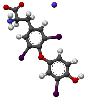 Liothyronine is a manufactured form of the thyroid hormone triiodothyronine (T3).[1] It is most commonly used to treat hypothyroidism and myxedema coma.[1] It is generally less preferred than levothyroxine.[1] It can be taken by mouth or by injection into a vein.[1]