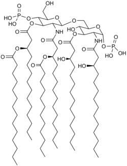 Lipid A is a lipid component of an endotoxin held responsible for the toxicity of gram-negative bacteria. It is the innermost of the three regions of the lipopolysaccharide (LPS), also called endotoxin molecule, and its hydrophobic nature allows it to anchor the LPS to the outer membrane.[2] While its toxic effects can be damaging, the sensing of lipid A by the immune system may also be critical for the onset of immune responses to gram-negative infection, and for the subsequent successful fight against the infection.[3]