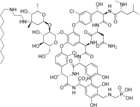 - 1 2 3 Van Bambeke F. (August 2006). "Glycopeptides and glycodepsipeptides in clinical development: a comparative review of their antibacterial spectrum, pharmacokinetics and clinical efficacy". Curr Opin Investig Drugs. 7 (8): 740–9. PMID 16955686.