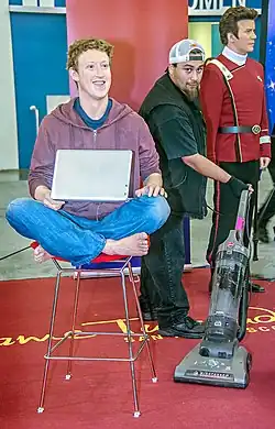 - Mark Zuckerberg (b. 1984) — US businessman and the founder of the social media service Facebook, known for frequently appearing in public barefoot or wearing only flip-flops.[91][92] His wax sculpture at the Madame Tussauds museum also depicts him barefooted.[93]