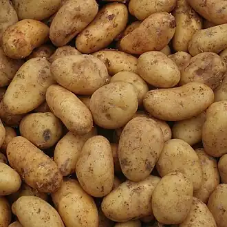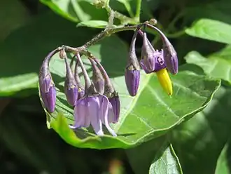 Solanum tuberosum potato Solanaceae Potatoes contain toxic glycoalkaloids, of which the most prevalent are solanine and chaconine. Solanine is also found in other members of the Solanaceae plant family, which includes Solanum lycopersicum (tomato), Atropa belladonna (deadly nightshade), and Hyoscyamus niger (henbane) (see entries below). The concentration of glycoalkaloids in wild potatoes is sufficient to produce toxic effects in humans. The toxin affects the nervous system, causing headaches, diarrhea and intense digestive disturbances, cramps, weakness and confusion, and in severe cases coma and death. Poisoning from cultivated potatoes occurs very rarely, however, as toxic compounds in the potato plant are generally concentrated in the green portions of the plant and in the fruits, and cultivated varieties contain smaller concentrations than wild plants.[39][40] Cooking at high temperatures (over 170 °C or 340 °F) also partly destroys the toxin. However, exposure to light, physical damage, and age can increase glycoalkaloid content within the tuber,[41] with the highest concentrations occurring just underneath the skin. Tubers that are exposed to light turn green from chlorophyll synthesis, thus giving a visual clue as to areas of the tuber that may have become more toxic; however, this does not provide a definitive guide, as greening and glycoalkaloid accumulation can occur independently of each other. Some varieties of potato contain greater glycoalkaloid concentrations than others; breeders developing new cultivars try to keep solanine levels below 200 mg/kg (200 ppmw). However, when these commercial varieties turn green, even they can approach solanine concentrations of 1000 mg/kg (1000 ppmw). The U.S. National Toxicology Program suggests that the average American consume no more than 12.5 mg/day of solanine from potatoes (the toxic dose is several times this, depending on body weight).