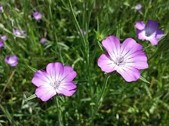 Agrostemma githago corn cockle Caryophyllaceae Contains the saponins githagin and agrostemmic acid. All parts of the plant are reported to be poisonous and may produce chronic or acute, potentially fatal poisoning, although it has been used in folk medicine to treat a range of ills, from parasites to cancer. There are no known recent clinical studies of corn cockle which provide a basis for dosage recommendations; however, doses higher than 3 g (of seeds) are considered toxic.[46]
