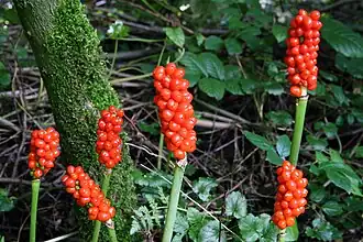 Arum maculatum cuckoo-pint, lords and ladies, jack-in-the-pulpit, wake robin, wild arum, devils and angels, cows and bulls, Adam and Eve, bobbins, starch-root Araceae All parts of the plant are highly toxic to humans and most animals. The bright red berries contain calcium oxalate raphides and soluble oxalates of saponins (as well as trace amounts of cyanogens and coniine) which can cause skin, mouth, and throat irritation, resulting in swelling, burning pain, breathing difficulties, and stomach upset. A. maculatum is one of the most common causes of accidental plant poisoning based on attendance at hospital emergency departments.[58] However, their acrid taste and the almost immediate tingling sensation in the mouth means that large amounts are rarely consumed and serious harm is unusual.[59] Touching the plant can cause contact dermatitis.[60] Fresh plant material is more toxic than dried plant parts.[60]