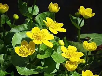Caltha palustris marsh-marigold, kingcup Ranunculaceae It contains several active substances of which the most important from a toxicological point of view is protoanemonin. Ingesting large quantities of the plant may cause convulsions, burning of the throat, vomiting, bloody diarrhea, dizziness, and fainting. Contact of the skin or mucous membranes with the juices can cause blistering or inflammation, and gastric illness if ingested. Younger parts seem to contain lower toxin concentrations and heating breaks these substances down. Small amounts of Caltha in hay do not cause problems when fed to livestock, but larger quantities can lead to gastric illness.[74]