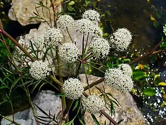 Cicuta spp. water hemlock, cowbane, wild carrot, snakeweed, poison parsnip, false parsley, children's bane, death-of-man Apiaceae The root, when freshly pulled out of the ground, is extremely poisonous and contains cicutoxin, a central nervous system stimulant that induces seizures. When dried, the poisonous effect is reduced. The most common species is C. maculata; one of the species found in the Western United States, C. douglasii, often found in pastures and swamps, has especially thick stems and very large and sturdy flowers which are sometimes harvested for flower displays. This is inadvisable as the sap is also toxic.