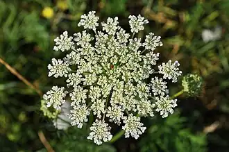 Conium maculatum hemlock, poison hemlock, spotted parsley, spotted cowbane, bad-man's oatmeal, poison snakeweed, beaver poison Apiaceae All parts of the plant contain γ-coniceine and its derivative coniine, as well as similar alkaloids, which are toxic to all mammals and many other organisms.[91][92] Ingestion can cause stomach pain, vomiting, and progressive paralysis of the central nervous system; ingestion of more than 100 milligrams of coniine (equal to about six to eight fresh leaves, or even smaller doses of the seeds and roots) can be fatal for adult humans.[93][94] Coniine works primarily by inhibiting nicotinic acetylcholine receptors in nerve cells, which can cause narcotic-like effects as soon as 30 minutes after ingestion, followed by an ascending neuromuscular dysfunction leading to paralysis of the respiratory muscles and ultimately death by oxygen deprivation.[95] Contrary to a common myth, scientific studies have disproven that humans can be exposed to hemlock alkaloids by ingesting the milk or meat of animals which have eaten the plant.[96] C. maculatum should not be confused with the trees commonly called hemlock (Tsuga spp.), which, while not edible, are not nearly as toxic as the herbaceous plant. An infusion of poison hemlock is said to have killed Socrates in 399 BC.
