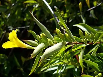 Gelsemium sempervirens Carolina jessamine, yellow jessamine, evening trumpet vine Gelsemiaceae Phytochemical studies have revealed that all parts of all species are rich in iridoids and alkaloids including gelsemine, koumine, gelsenicine, and gelsevirine; concentrations are especially high in the roots. The median lethal dose of a crude alkaloidal extraction isolated from Gelsemium elegans was determined to be 1.2 mg/kg when given to mice intravenously. The alkaloids act on nerve endings causing paralysis, muscle weakness, and clonic convulsions. Typical symptoms of intoxication include sweating, dizziness, nausea, vomiting, blurred vision, muscular weakness, limb paralysis, dilated pupils, breathing difficulty, coma, and convulsion.[130][131] At high doses the alkaloids act centrally on the nervous system against the neurotransmitter gamma-amino butyric acid (GABA), causing depression of the nervous system and death by respiratory failure. Livestock are at greatest risk of eating the plants in winter as the plants are evergreen and the leaves remain attractive when all other forage is not.[132] It is possible to become ill from ingesting honey made from jessamine nectar.