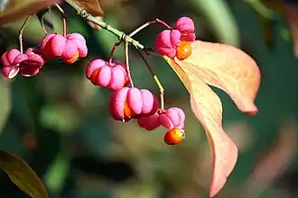 Euonymus europaeus spindle, European spindle, spindle tree Celastraceae The fruit is poisonous, containing among other substances the alkaloids theobromine and caffeine, as well as an extremely bitter terpene. Poisonings are more common in young children, who are enticed by the brightly coloured fruits. Ingestion can result in liver and kidney damage and even death. There are many other species of Euonymus, many of which are also poisonous.