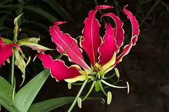 Gloriosa superba flame lily, climbing lily, gloriosa lily, fire lily Colchicaceae The plant is toxic enough to cause human and animal fatalities if ingested. Every part of the plant is poisonous, especially the tuberous rhizomes. As with other members of the Colchicaceae, this plant contains high levels of colchicine, a toxic alkaloid. It also contains the alkaloid gloriocine. Within a few hours of the ingestion of a toxic amount of plant material, a victim may experience nausea, vomiting, numbness and tingling around the mouth, burning in the throat, abdominal pain, and bloody diarrhea. As the toxic syndrome progresses, rhabdomyolysis, ileus, respiratory depression, hypotension, coagulopathy, haematuria, altered mental status, seizures, coma, and ascending polyneuropathy may occur.[133]