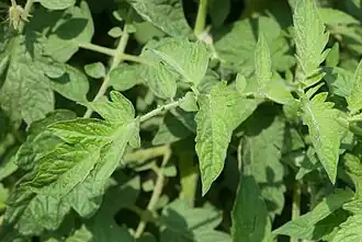 Solanum lycopersicum tomato Solanaceae Like many other members of the nightshade family Solanaceae, tomato leaves and stems contain solanine, a glycoalkaloid which is toxic if ingested, causing digestive upset and nervous excitement. Use of tomato leaves as an herbal tea (infusion) has been responsible for at least one death.[35] Leaves, stems, and green unripe fruit of the tomato plant also contain small amounts of the poisonous alkaloid tomatine,[36] although levels are generally too small to be dangerous.[36][37] Ripe tomatoes do not contain any detectable tomatine.[36] Tomato plants can be toxic to dogs if they eat large amounts of the fruit or chew the plant material.[38]