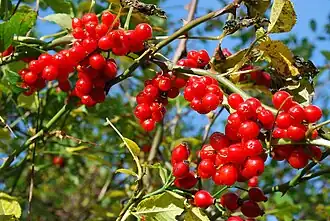 Daphne spp. daphne, garland flower, mezereum, spurge laurel Thymelaeaceae All parts of all species in this genus, especially the berries (variously red, yellow, blue, or black), are highly toxic, the primary active principle being the glycoside daphnin; some species also contain mezerein. Ingestion of even just a few berries can produce a burning sensation in the mouth, severe abdominal pain, vomiting, bloody diarrhea, weakness, stupor, and convulsions, followed by coma; it is often fatal.[102] Corrosive lesions of the oral mucosa and upper gastrointestinal tract may also occur, and nephritis has been reported.[102] The sap and berry juice may cause allergic dermatitis in sensitive individuals.[103]