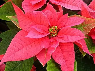 Euphorbia pulcherrima poinsettia Euphorbiaceae Contrary to a popular myth,[116] poinsettias are only very mildly toxic, if at all, and in most contexts are considered non-toxic both to humans and domestic pets; a review of more than 22,000 reported cases of poinsettia exposure, the majority of which occurred in children, found that 92% of those exposed did not develop any symptoms at all, and no deaths resulting from ingestion of any part of the poinsettia plant have ever been documented.[117][118] Contact with the plant usually has no effect,[119] though its latex can cause an allergic reaction in sensitive individuals.[120][121] It may also be mildly irritating to the skin or stomach[122] and sometimes causes diarrhea and vomiting if eaten. Sap introduced into the human eye may cause temporary blindness.[123] Poinsettia is similarly only mildly toxic to cats, dogs, and horses,[124] and very rarely necessitates veterinary treatment.[125]
