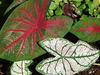 Caladium spp. angel wings, elephant ear, heart of Jesus Araceae All parts of all plants in this genus contain insoluble calcium oxalate crystals, which are toxic. Symptoms of ingestion generally include irritation and burning of the mouth, lips, and throat, nausea and vomiting, abdominal pain, diarrhea, muscle twitching, and sometimes swelling of the mouth or tongue, which can cause breathing to become fatally blocked. In severe cases chronic kidney disease or renal failure can occur.[71] They are poisonous to dogs and cats as well as humans.[72]