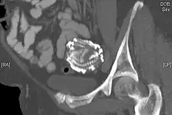 A lithopedion (also spelled lithopaedion or lithopædion; from Ancient Greek: λίθος "stone" and Ancient Greek: παιδίον "small child, infant"), or stone baby, is a rare phenomenon which occurs most commonly when a fetus dies during an abdominal pregnancy,[1] is too large to be reabsorbed by the body, and calcifies on the outside as part of a foreign body reaction, shielding the mother's body from the dead tissue of the fetus and preventing septic infection.