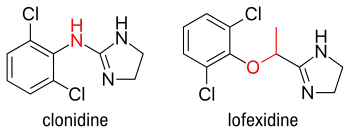 Lofexidine is structurally analogous to clonidine, another α2 adrenergic receptor agonist used for treatment of opioid withdrawal symptoms. A comparison of the two structures is shown at right. Both contain an imidazoline ring and a 2,6-dichlorinated phenyl ring. The differences in structure are shown in red, while the similarities are in black. In addition to the structural differences, administration of lofexidine to people who abuse opioids has been shown to be more effective for a longer duration, with fewer withdrawal symptoms than clonidine even after one day.[14] However, clonidine is often preferred as it is substantially cheaper than lofexidine when purchased with a private (non-NHS) prescription. This factor is exacerbated by the considerable number of and quantities of medications prescribed to alleviate the constellation of withdrawal signs and symptoms. Additionally, clonidine has been shown to significantly lower blood pressure. Therefore, although similar to lofexidine, clonidine is most frequently prescribed to treat high blood pressure.