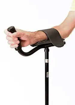 A forearm crutch (also commonly known as an elbow crutch, Canadian crutch or "Lofstrand" crutch due to a brand by this name) has a cuff at the top that goes around the forearm.[1] It is used by inserting the arm into the cuff and holding the grip. The hinged cuff, most frequently made of plastic or metal, can be a half-circle or a full circle with a V-type opening in the front allowing the forearm to slip out in case of a fall. They can be both centrally-mass- manufactured or using distributed manufactured with 3-D printers from open source plans.[8]