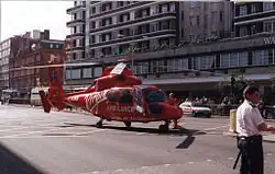 In 2004, the service was featured heavily in the BBC television series Trauma.[30] In 2009, a standalone documentary about the air ambulance was made for the BBC by North One Television. Medic One: Life and Death in London showcased the service in a number of emergencies.[31] In 1993, the HEMS team were the subject of the pilot episode of the innovative TV series Blues and Twos. The TV crew were filming when the Bishopsgate bomb was detonated.[32] In 1994, they featured in a special episode of the BBC series 999 entitled "The Flying Doctors". They also featured in BBC Two's An Hour to Save Your Life.