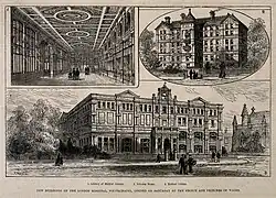 ![]() The London Hospital Medical College (bottom) on a wood engraving of 1877 | |