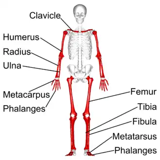 The long bone category includes the femora, tibiae, and fibulae of the legs; the humeri, radii, and ulnae of the arms; metacarpals and metatarsals of the hands and feet, the phalanges of the fingers and toes, and the clavicles or collar bones. The long bones of the human leg make up nearly half of adult height. The other primary skeletal component of height are the vertebrae and skull.