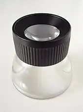A loupe (/ˈluːp/ LOOP) is a simple, small magnification device used to see small details more closely.[1] They generally have higher magnification than a magnifying glass, and are designed to be held or worn close to the eye. A loupe does not have an attached handle, and its focusing lens(es) are contained in an opaque cylinder or cone. On some loupes this cylinder folds into an enclosing housing that protects the lenses when not in use.