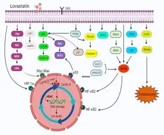 {{cite journal}}: CS1 maint: multiple names: authors list (link) - ↑ Jakóbisiak M, Bruno S, Skierski J, Darzynkiewicz Z (1991). "The cell cycle specific effects of lovastatin". Proc Natl Acad Sci USA. 88: 3628–3632. doi:10.1073/pnas.88.9.3628. PMC 51505. PMID 1673788.