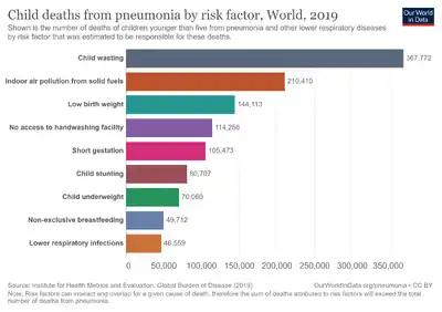 Particulate matter, a component of ambient air pollution, is associated with increased risk of low birth weight.[12][13] Because particulate matter is composed of extremely small particles, even nonvisible levels can be inhaled and present harm to the fetus.[14] Particulate matter exposure can cause inflammation, oxidative stress, endocrine disruption, and impaired oxygen transport access to the placenta, all of which are mechanisms for heightening the risk of low birth weight.[15] To reduce exposure to particulate matter, pregnant women can monitor the EPA’s Air Quality Index and take personal precautionary measures such as reducing outdoor activity on low quality days, avoiding high-traffic roads/intersections, and/or wearing personal protective equipment (i.e., facial mask of industrial design). Indoor exposure to particulate matter can also be reduced through adequate ventilation, as well as use of clean heating and cooking methods.[16][17]