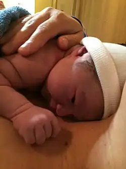 There is increasing evidence that suggests that early skin-to-skin contact between mother and baby stimulates breastfeeding behavior in the baby. Newborns who are immediately placed on their mother's skin have a natural instinct to latch on to the breast and start nursing, typically within one hour of birth. Immediate skin-to-skin contact may provide a form of imprinting that makes subsequent feeding significantly easier. Interrupting the process, such as removing the baby to weigh him/her, may complicate subsequent feeding.[16]