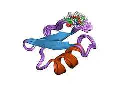 Lq2 is a small peptide of 37 amino acids. Lq2 contains the classical scorpion toxin alpha-beta scaffold and is structurally similar to the neurotoxin Charybdotoxin (CTX).[5] Lq2 consists of an α-helix and a β-sheet, connected by an αβ3 loop containing disulfide bridges. The proteins three-dimensional structure has been reconstructed using nuclear magnetic resonance techniques.[5]