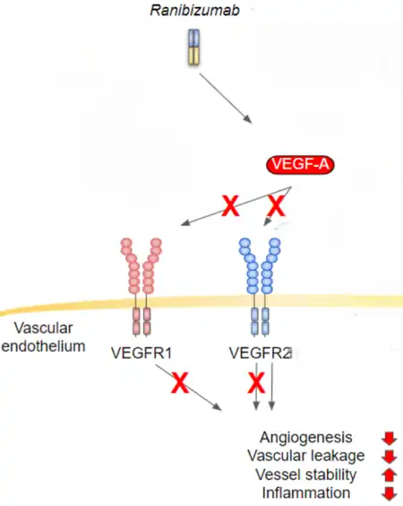 Common side effects include conjunctival bleeding, eye pain, floaters, and increased intraocular pressure.[2] Other side effects may include endophthalmitis and retinal detachment.[2] It is a small piece of monoclonal antibody that attaches to and blocked vascular endothelial growth factor A (VEGF-A).[1]