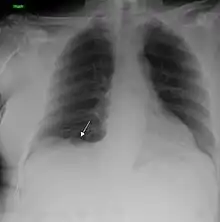 | A chest X-ray showing a tumor in the lung (marked by arrow) | |
