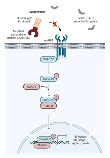 It binds TGF (transforming growth factor beta) superfamily ligands to reduce SMAD signaling. The reduction in SMAD signaling leads to enhanced erythroid maturation.[9]