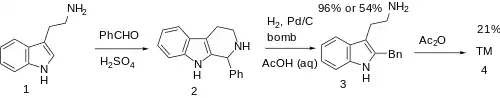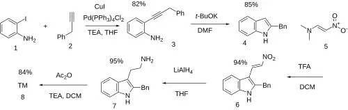- ↑ Righi, Marika; Topi, Francesca; Bartolucci, Silvia; Bedini, Annalida; Piersanti, Giovanni; Spadoni, Gilberto (2012). "Synthesis of Tryptamine Derivatives via a Direct, One-Pot Reductive Alkylation of Indoles". The Journal of Organic Chemistry. 77 (14): 6351–6357. doi:10.1021/jo3010028.