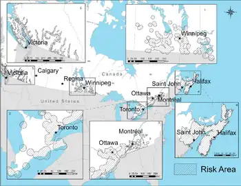 - ↑ Ogden NH, Lindsay LR, Morshed M, Sockett PN, Artsob H (June 2009). "The emergence of Lyme disease in Canada". CMAJ. 180 (12): 1221–4. doi:10.1503/cmaj.080148. PMC 2691438. PMID 19506281.