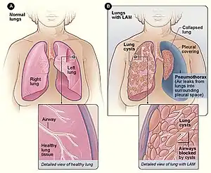 | Figure A shows the location of the lungs and airways in the body. The inset image shows a cross-section of a healthy lung. Figure B shows a view of the lungs with LAM and a collapsed lung (pneumothorax). The inset image shows a cross-section of a lung with LAM. | |