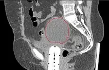 A lymphocele is a collection of lymphatic fluid within the body not bordered by epithelial lining.[1] It is usually a surgical complication seen after extensive pelvic surgery (such as cancer surgery) and is most commonly found in the retroperitoneal space. Spontaneous development is rare.[2]